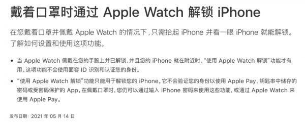 该功能可以在系统检测到用户佩戴口罩时,利用手表解锁iPhone,