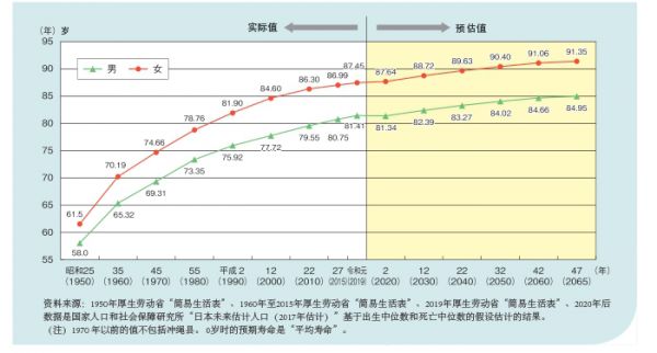 日本不仅是全世界老龄化程度最高的国家,也是人均寿命最长的国家。2020年,日本的男女平均寿命分别为81.3岁和87.6岁,预计到2050年,日本的男性平均寿命为84岁、女性平均寿命将超过90岁,日本老龄化率也将上涨到37.7%。