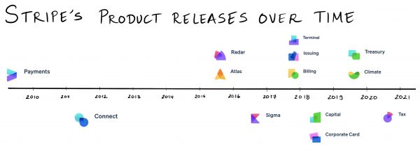 现在距离那次采访还不到 6 年,很明显 Stripe 已经为产品规模的持续扩大奠定了基础。该公司在成立的前五年一共推出了两款产品;但在过去不到五年的时间里就一共发布了9款产品。