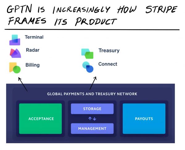 毫无疑问,之所以出现提速,部分是因为围绕着 Stripe 正在开发的东西的一致性在提高。从 2018 年开始,Stripe 开始把自己的套件描述成全球支付库存网络(Global Payments Treasury Network ,GPTN)。