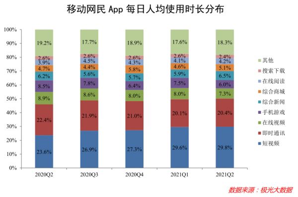 自2017年以来,伴随着互联网流量红利的日趋衰减,很多平台都面临着增长乏力的困境。可就在此时,短视频的异军突起成为了一道亮丽的风景,不仅用户数量增长迅猛,使用时长亦是节节攀升,特别是在2020年的特殊环境之下,短视频平台逆势而上,2020Q2用户时长占比(23.6%)首次超过即时通讯(22.4%),此后二者的差距便越拉越大,2021Q2已达到9.4个百分点(短视频29.8%,即时通讯20.4%)。短视频已成长为不折不扣的第一大流量入口。