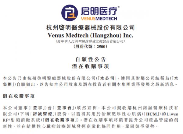 近日,启明医疗(02500.HK)发布公告,公司拟收购杭州诺诚医疗科技有限公司(诺诚医疗)股份,以获得其用于治疗肥厚型心肌病(HCM)的Liwen RF射频消融系统。