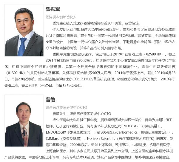 如今,虽然明面上德诺资本已经在启明医疗上市之际退出,但德诺医疗与启明医疗依旧息息相关。德诺医疗官网的品牌页面上,启明医疗仍然排名第一;而启明医疗的创始人訾振军和董事会主席曾敏也位列德诺医疗管理团队之中。