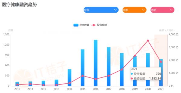 据 IT 桔子数据库,近 5 年医疗健康行业的私募股权投资交易总额迎来爆发式增长,2020 年医疗健康投资总额为 3538.49 亿元;截至今年 8 月,2021 年投资金额已超过去年总额的一半,达到 1882.34 亿元。在交易数量上,2020 年投资交易数量为 960 起;截至今年 8 月,2021 年投资交易数量为 790 起,交易数量即将追平。
