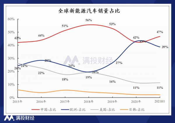 中国是全球最大、发展最快的新能源汽车市场,市场份额领跑全球。2021年上半年,中国新能源汽车销量占比为47%,超越欧洲,重回第一;欧洲市场因为补贴退坡,占比回落至39%。