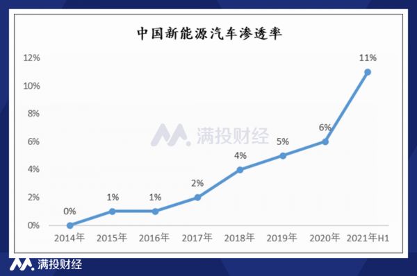 据中国汽车协会的数据,2021年上半年,国内新能源汽车的销量达到119万辆,同比增长224%,新能源乘用车的渗透率也大幅提升至11%,创历史新高。随着渗透率的显著提升,新能源汽车行业的“磁性”就会越来越强,且中国汽车市场庞大,未来仍有非常大的发展空间。