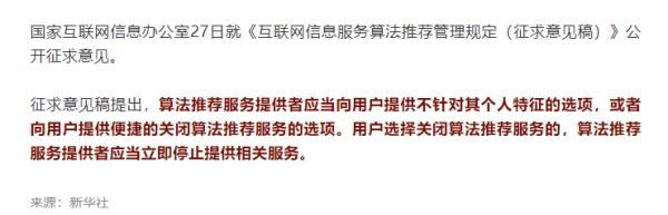 巧合的是,也就是在今天上午,国家互联网信息办公室就关于《互联网信息服务算法推荐管理规定(征求意见稿)》公开征求意见,《意见》中明确算法推荐服务提供者不得利用算法虚假注、非法交易、操纵用户账号,或者虚假点赞、评论、转发等;不得利用算法屏蔽信息、过度推荐、操纵榜单或者检索结果排序、控制热搜或者精选等干预信息呈现。并且,相关规定也明确了算法推荐服务提供者应当向用户提供不针对其个人特征的选项,或者向用户提供便捷的关闭算法推荐服务的选项。