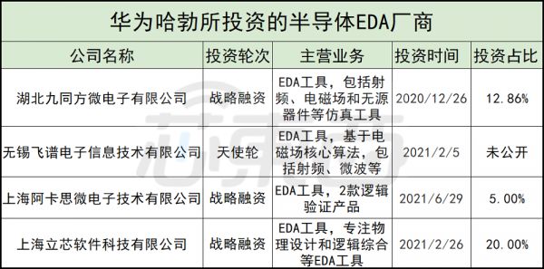 华为哈勃在这一领域布局了湖北九同方微电子有限公司、上海阿卡思微电子技术有限公司、无锡飞谱电子信息技术有限公司和上海立芯软件科技有限公司4家企业。