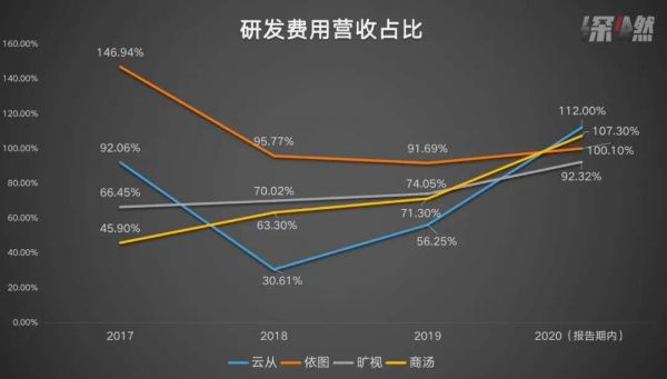 商汤和旷视在报告期内的研发投入力度相对稳健,伴随营收的增加稳步提升;云从最不稳定,2018年全年的研发投入只有1.48亿元,营收占比为30.6%,到2020H1,对应的比例是112%;依图的研发费用占比始终保持在90%以上,2020年上半年超过了100%。
