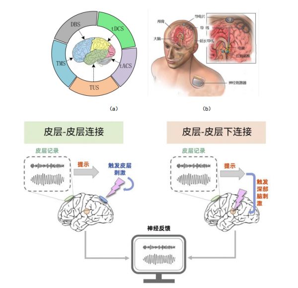 与之相对应的,是输出式脑机接口,即,由外部设备或机器,绕过外周神经或肌肉系统,直接向大脑输入电、磁、声和光的刺激等或神经反馈,目的是调控中枢神经活动。常见的深部脑刺激(DBS)、经颅磁刺激(TMS)、经颅直流/交流电刺激(tDCS/tACS)、颅超声刺激(TUS)等都属于此类。