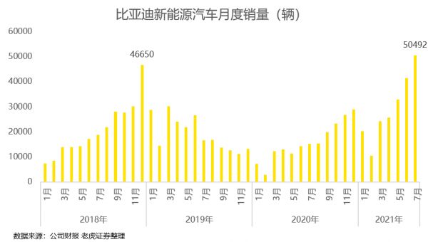 辉煌的成绩并没有止步半年报,根据8月初发布的7月份产销快报,比亚迪7月新能源汽车销量超过5万辆大关,创出新的记录。