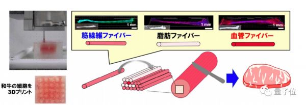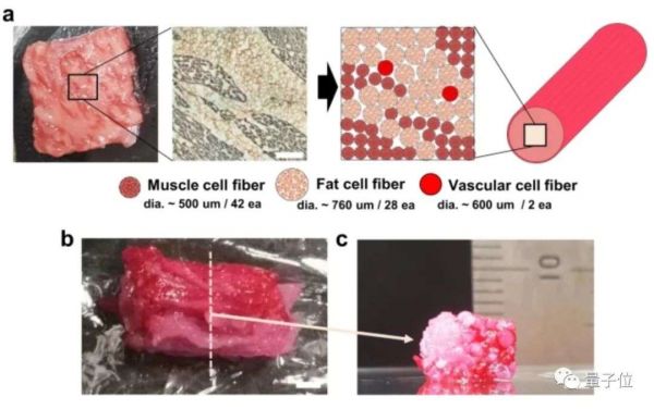 最终共构建了42块肌肉、28块脂肪组织和2条毛细血管组成的总共72根纤维,组装出直径为5毫米、长度为10毫米的类似牛排的肉。