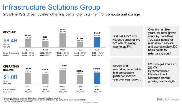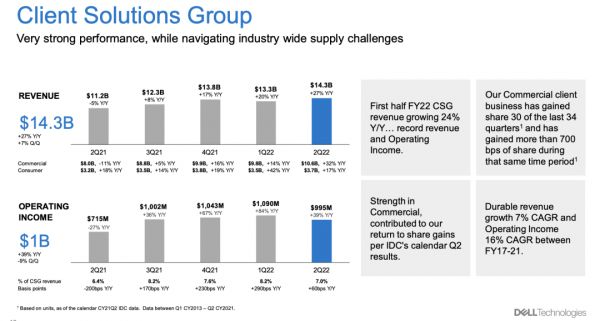看财报数据,戴尔主要业务线分为两条:客户解决方案(Client Solutions Group ) 和基础建设解决方案(Infrastructure Solutions Group,ISG),外加旗下云计算软件和硬件虚拟化服务商VMware。其中,CSG包括硬件产品,包括PC、平板、品牌外设以及附带的软件和服务;ISG是戴尔的服务器和网络业务。