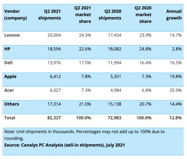 据调研机构Canalys追踪,今年第二季度,全球PC市场出货量增长13%,市场排位格局未有太大变化。