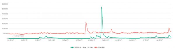 在下载量上,数据显示,阿里云盘在公测当天以304360次下载量级超过百度网盘后,此后基本与百度网盘相差数万下载量级/每天。