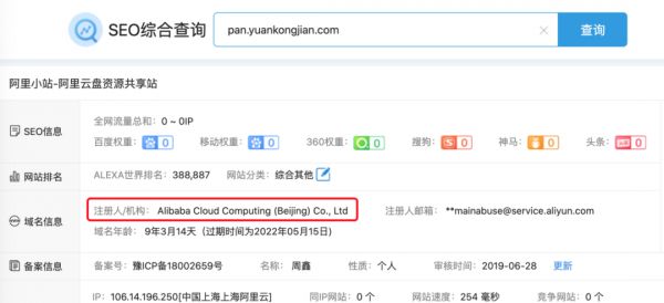 通过站长工具查询后,最有趣的一幕出现了,该域名的注册机构为「Alibaba Cloud Computing (Beijing) Co.,Ltd」,即北京阿里巴巴云计算,倘若信息属实,说明阿里云盘已经意识到了资源生态对于网盘产品的重要性。