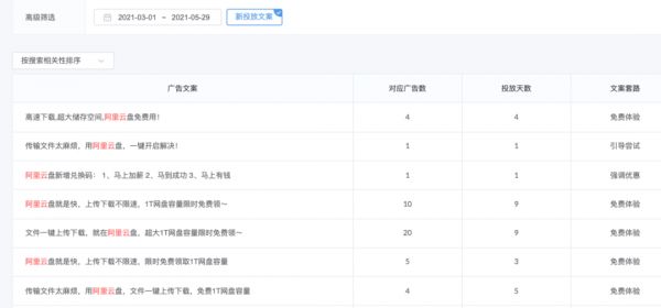 通过移动广告情报分析平台「AppGrowing」查询,在2021年3月2日和5月30日期间,阿里云盘铺设的广告文案中,主要以下载速度快、存储空间大,免费使用为卖点,其中下载速度是阿里云盘市场竞争力的核心。