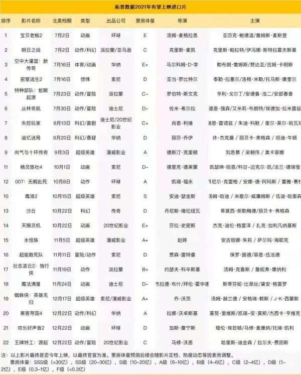 拓普数据曾预测,2021年有望上映的进口片为22部,这些影片能否全部引进,还会受到包括引进策略、北美影片档期调整等因素影响。