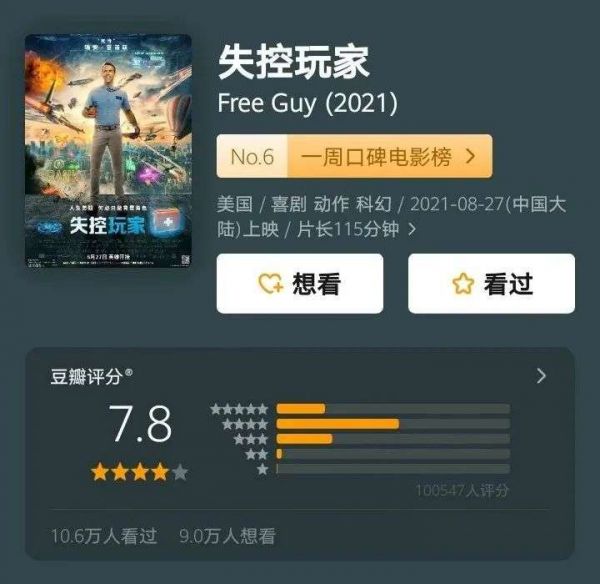 紧急定档、宣发空窗期较短,也让不少好莱坞影片难以触达更多观众群。灯塔专业版数据显示,《失控玩家》在8月19日官宣引进到定档8月27日这8天时间里,虽然共有19个营销事件,但其转换率并不高。在豆瓣评分7.8的情况下,目前该片的想看人数也不过10万。