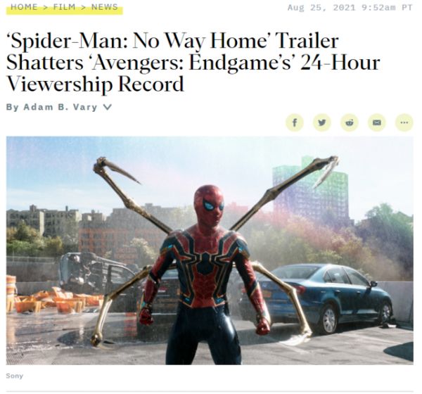 大众仍然对好莱坞大片抱有期待。8月24日《蜘蛛侠:英雄无归》正式发布首个预告,24小时观看高达3.56亿次。成为“史上发布24小时内全球观看次数最多的预告”,此前冠军为24小时观看量2.89亿次的《复联4》的首预告。