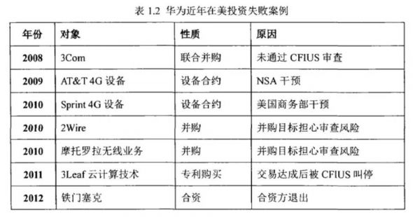 2007 年,华为试图并购3com公司,被美国政府阻止;2010年5月,华为试图收购加州一个破产公司3Leaf 的部分资产,被美国相关部门阻挠;