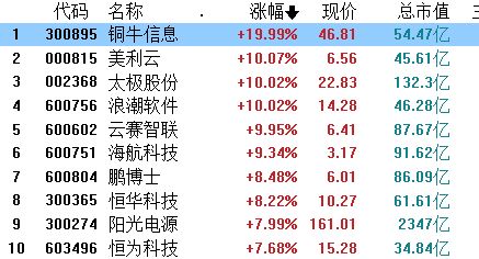 其中,铜牛信息暴涨20%,两日大涨44%;美利云涨超10%,两日大涨21%;此外太极股份、浪潮软件今日也纷纷涨停,绿盟科技、卫士通等跟涨。