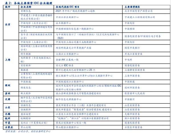 更重要的是,具备国资背景、满足等保二级要求的IDC机房,也将面对很大的市场,有望最大程度受益区域性国资云的建设与托管运营需求。例如杭钢股份(浙江省国资委控股)、数据港(北京市人民政府)、特发信息(深圳特发)、数据港(上海静安国资委)、铜牛信息(北京国资委)等。