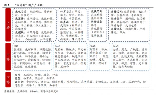 上游是国产芯片、服务器和储存设备等基础设备需求,这一部分的需求量有望在国资云的普及下进一步上行。 例如根据天津的方案,国资云需要满足等保2.0等新标准,大概率采用私有云技术路线,预计会开启服务器等基础设施的新一轮集中采购,可关注的标的包括中科曙光、深信服、中国长城等。