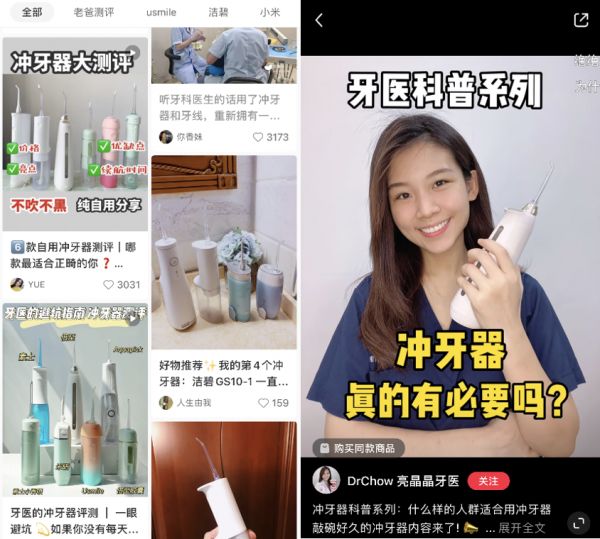这一数据也说明如今人们的口腔护理越来越精细化。除了最基础的刷牙,不少人使用牙线、漱口水对口腔及牙齿进行更全面深度的清洁,此外,随着正畸广受热捧,用脉冲水流清洁牙间隙的冲牙器也从过去的口腔医院/诊所逐渐进入到人们的日常生活。小红书上搜索“冲牙器”有超过3万篇笔记和1300+件商品,其中除了松下、拜耳等国际品牌,也有usmile、素士、罗曼等新兴国产品牌的身影。