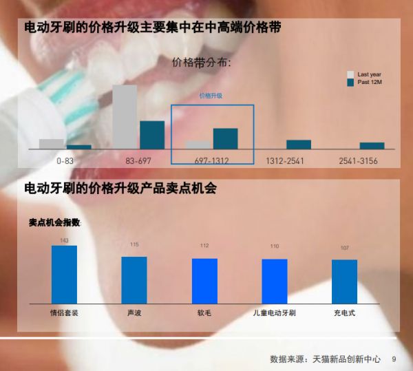 电动牙刷这一品类赛道在野蛮生长过后,也亟需迎来新的升级。据《2020年口腔护理行业最新趋势报告》显示,2020年电动牙刷的增长主要由价格升级驱动,其中情侣套装、声波式电动牙刷、儿童电动牙刷或将成为新的卖点机会。
