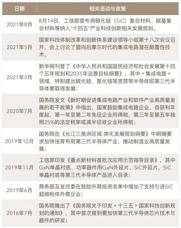 政策加码、行业加持,从2016年开始,政府不断出台与第三代半导体相关的政策材料,行业投资水涨船高,市场销售额也在每年大幅上涨。