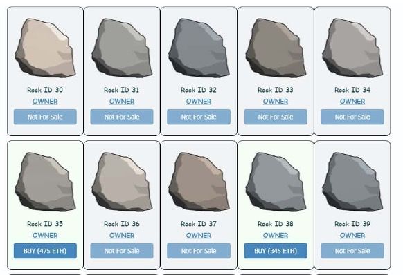 几周前,“ETHRock #21”以 45 个以太坊(现价约14.8万美元)的价格售出,而这几天它们的价格更是直冲月球,最近成交的一些石头价格分别为64万、71万、83万美元不等,现在平台上最便宜的一颗石头都要卖到95个以太币(约31万美元)。