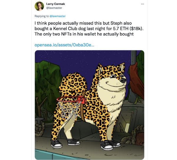 但最终库里还是豪掷55个以太坊把该只猿猴收入囊中之外。此外,“宠猿达人”库里还花了5.7个以太坊(约1.8万美元)在BAYC社群里为自己的猿购买了一只绑着篮球框的豹纹NFT伴侣犬。
