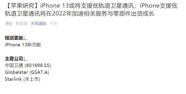 事实上,我国企业在卫星互联网领域的发展势头也不容小觑。在郭明錤此次的预测中,其提到最有可能与苹果合作的是Globalstar,此外还点名了马斯克的SpaceX以及中国卫星通讯服务商中国卫通。受此消息影响,中国卫通周一开盘后涨停,其他A股市场低轨卫星概念股也大涨。