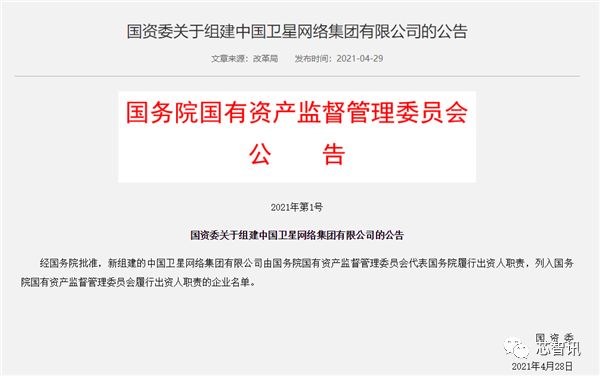 不仅如此,国资委5月发布公告,经国务院批准,新组建中国卫星网络集团有限公司。据悉,中国卫星网络集团有限公司由国务院国资委代表国务院履行出资人职责,列入国务院国资委履行出资人职责的企业名单。据新华社报道,中国卫星网络集团有限公司将是第一家注册落户雄安新区的中央企业。
