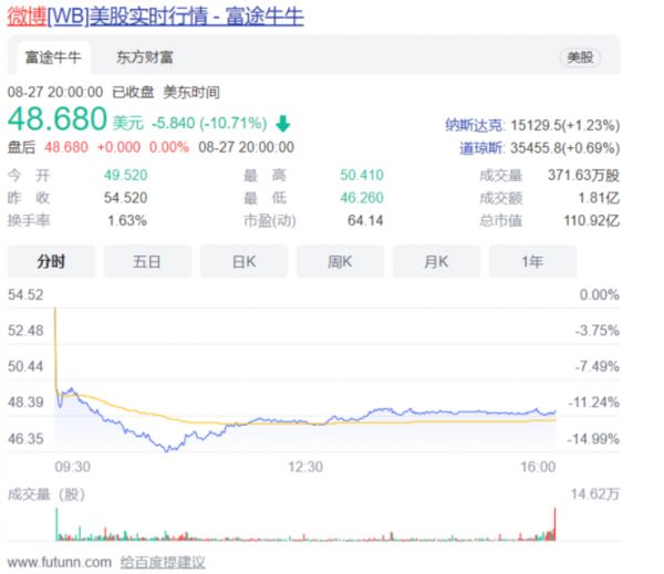 美东时间,8月27日,至美股收盘,微博跌幅超过10%,其中当天最大跌幅超过15%,使得Q2季度财报净营收与月活跃用户增长,所带来的股价涨幅,一夜回到了“解放前”。