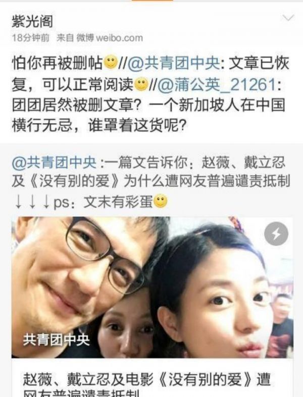 而这种舆论操作,新浪微博早在多年前,就引发过民众的热议。2016年,共青团中央发布长微博“赵薇、戴立忍及电影《没有别的爱》遭网友普遍谴责抵制”。其文章讲述到赵薇新片被抵制的原因是主演戴立忍曾参与台独相关活动,而另一位主演水原希子曾为辱华照片点赞。