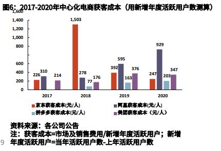 由下图可知,主流电商的获客近年来都有不同程度的上涨,阿里系电商新增获客成本已经从2017年的310元/人,暴增至2020年的929元/人,拼多多的获客成本也上升到203元/人,京东2018年的获客成本更是飙升到了1503元/人,这意味着转嫁给商家的流量成本将会更高。