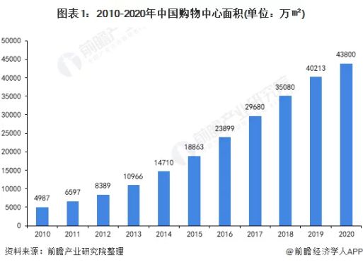 报告显示,近10年间,我国购物中心面积在逐年稳步增长,从2010年的4987万㎡增长到2020年的4.38亿㎡。