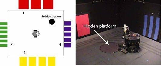 图2. 达尔文机10号在迷宫中找“看不见”的目标(见左侧示意图)。中间的方框表示迷宫,其右上角的黑圆表示“看不见”的目标,四周的彩色条表示在迷宫四边墙上显示的图形标记,数字表示在四次实验中,达尔文机(中心的图标)的四个不同的出发点。实际情形见右侧图。[8]