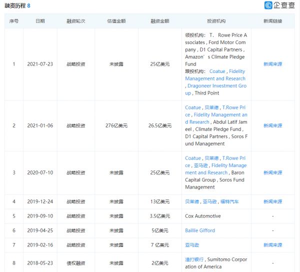 企查查资料显示,Rivian目前至少完成了8轮融资,仅2019年就完成了4轮,回顾Rivian的融资历程,投资方包括亚马逊、福特汽车、贝莱德等知名企业及机构,其中亚马逊、贝莱德等投资方甚至多次参与其中。