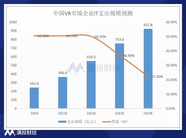 据IDC等机构统计,2020年全球VR/AR市场规模约为900亿元,其中VR市场规模620亿元,AR市场规模280亿元。以国内而言,中国VR市场企业IT支出规模预计将在2024年达到921.8亿元,2020-2024年复合增长率约为39.5%,行业处于高速增长期。细分到行业来看,VR教育的占比将最高,其次为制造、零售、消费以及服务业。