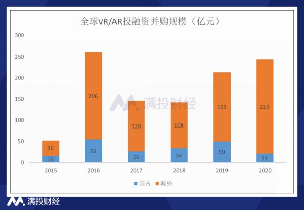 陀螺研究院数据显示,2020年全球VR/AR投融资规模达到244亿元,投融资并购发生220起,规模与数量均实现连续三年上涨。其中,海外VR/AR投资规模在绝对数量与相对增幅方面均领先国内,2018年-2020年。海外VR/AR投资规模分别为108/163/223亿元。考虑到国外VR/AR产业领先国内2-3年,资本对行业的研究和理解更加深入且投融资活动更活跃,预计未来2-3年国内VR/AR初创企业将迎来一波并购热潮。