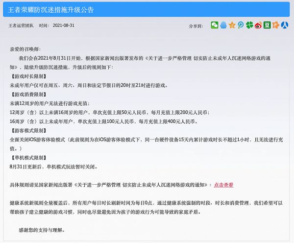 36氪获悉,王者荣耀公告称,会根据国家新闻出版署发布的《关于进一步严格管理切实防止未成年人沉迷网络游戏的通知》,陆续升级防沉迷措施。未成年用户仅可在周五、周六、周日和法定节假日的20时至21时进行游戏。未满12周岁的用户无法进行充值;12周岁(含)以上未满16周岁的用户,单次充值上限50元,每月充值上限200元;16周岁(含)以上未成年用户,单次充值上限100元,每月充值上限400元。同时,全面关闭ios游客体验模式,8月31日更新后单机模式玩法暂时关闭。