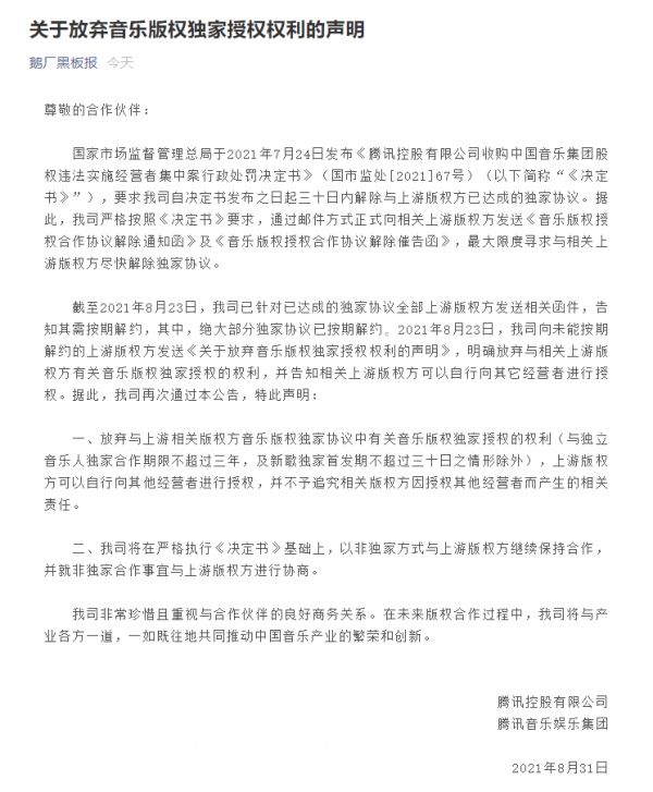 腾讯8月31日晚间宣布,放弃音乐版权独家授权权利。