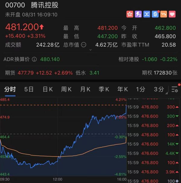 腾讯港股方面,8月31日股价低开高走,最终收涨逾3%。近期,由于股价大跌,腾讯连续回购,8月31日,再度耗资逾1亿港元回购。