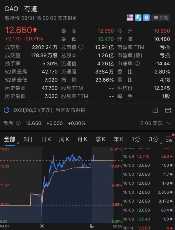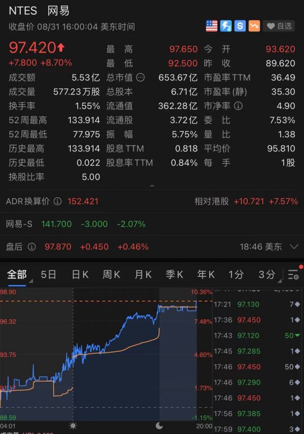 而网易方面也上涨8.7%,股价报收97.42美元,网易有道更是暴涨20.71%,股价报收12.65%。