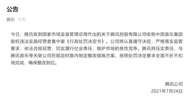7月24日,国家市场监管总局通报,依法对腾讯控股有限公司作出责令解除网络音乐独家版权等处罚。