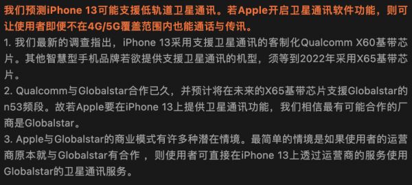 此外,苹果还将与卫星通信公司Globalstar合作,而高通也会在其全新的X65基带中实现对其n53频段的支持。