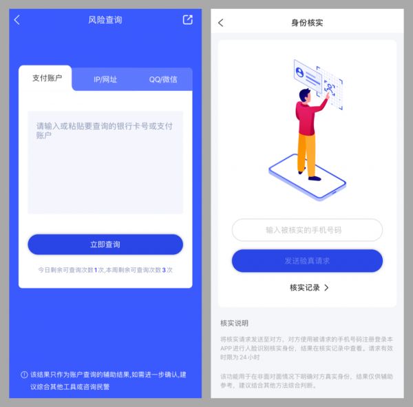 另外,还能查询可疑银行账号、IP地址、网址以及 QQ 和微信,包括对特定手机号进行身份核实的查询。